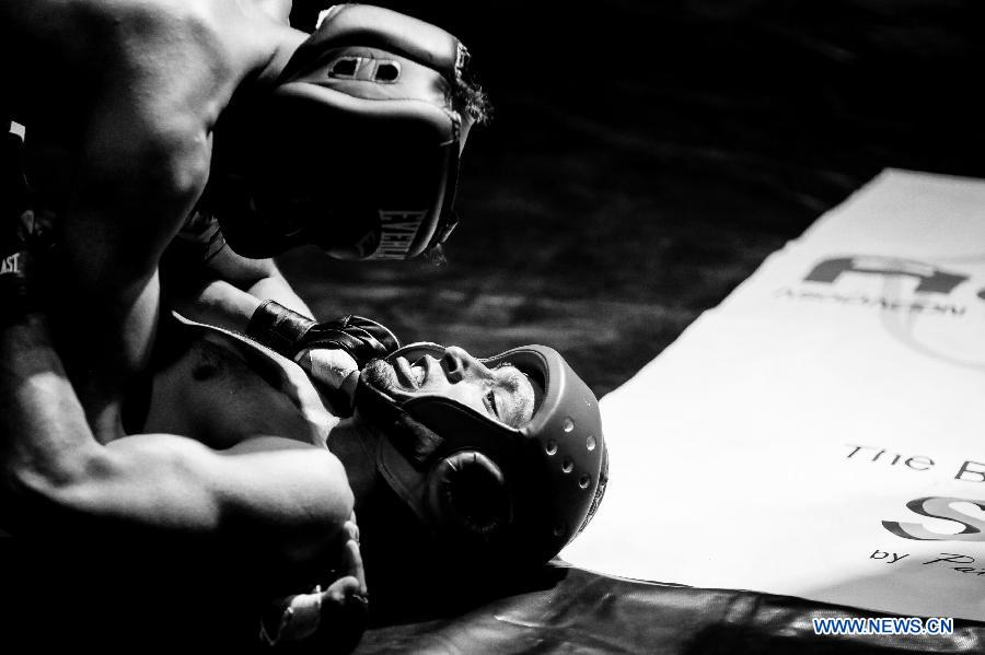 Les gens participent à un événement d'arts martiaux mélangés à Bogota, en Colombie, le 26 avril 2015. (Xinhua/Jhon Paz)