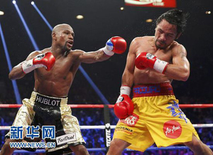 Le Philippin Manny Pacquiaore?oit un coup de poing décoché par l'Américain Floyd Mayweather, Jr. (à droite) lors du quatrième round de leur combat pour le titre de champion poids welter WBO, WBC et WBA à Las Vegas, dans le Nevada, le 2 mai 2015. Floyd Mayweatherest resté invaincu après 12 rounds dans le combat le plus richement doté de l'histoire de la boxe –il a rapporté au boxeur américain au moins 180 millions de dollars US (160 millions d'euros).