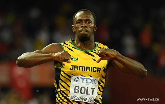 Usain Bolt, athlète jama?cain. Il est l'athlète le plus décoré des championnats du monde d'athlétisme, totalisant, après un nouveau triplé 100 m - 200 m - 4 x 100 m réalisé les 23, 27 et 29 ao?t 2015 à Pékin, onze médailles d'or et deux en argent. (Xinhua/Li Gang)