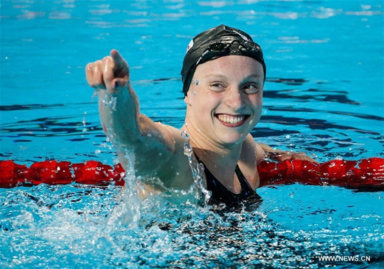 Katie Ledecky, nageuse américaine. Elle est la seule à avoir remporté 4 titres individuels en réalisant le quadruplet sur 200, 400, 800 et 1500 m nage libre aux Championnats du monde à Kazan en 2015. Elle y gagne aussi un titre avec le relai 4 * 200 nage libre américain. (Xinhua/Zhang Fan)