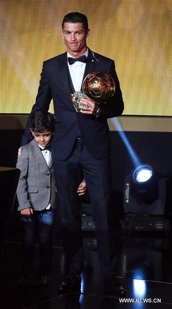 Cristiano Ronaldo, footballeur international portugais. Le 12 janvier 2015, il est sacré pour la troisième fois de sa carrière Ballon d'or. Le 23 mai, Cristiano Ronaldo termine Pichichi de la Liga pour la troisième fois et Soulier d'or européen avec 48 buts au compteur, et termine le 6 juin co-meilleur buteur de la Ligue des Champions, à égalité avec Lionel Messi et Neymar. Il établit ainsi lors de la saison 2014-2015 son meilleur total de buts en championnat. (Xinhua/Zhang Fan)