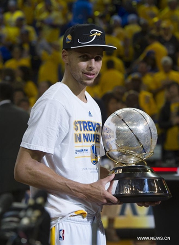 Stephen Curry, joueur américain de basket-ball professionnel. Le 4 mai 2015, Curry est nommé Most Valuable Player devant James Harden et LeBron James. Il devient ainsi le premier Warrior à remporter ce trophée depuis Wilt Chamberlain en 1960. Au terme d'une campagne de playoffs incroyable pour les Warriors, Curry termine avec des statistiques de 28,3 points, 6,4 passes et 5 rebonds de moyenne en 21 matchs avec des pourcentages de réussite plus que corrects, notamment à trois points avec 42,2%. (Xinhua/Yang Lei)
