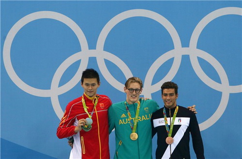 L’Australien Mack Horton (Centre), le Chinois Sun Yang (à gauche) et l’Italien Gabriele Detti posent avec leurs médailles lors de la cérémonie de remise des décorations du 400 m nage libre masculin à Rio de Janeiro, au Brésil, le 6 ao?t 2016. [Photo / Agences]