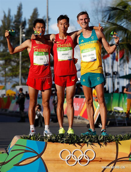 Le Chinois Wang Zhen (au centre), son compatriote Cai Zelin (à gauche) et l'Australien Dane Bird-Smith sur le podium du 20 km marche messieurs, lors des Jeux Olympiques de Rio, le 12 ao?t. Wang Zhen est devenu champion olympique du 20 km, en 1h 19 min 14 sec, devant Cai Zelin (1h 19:26) et Dane Bird-Smith (1h 19:37), vendredi à Rio. (Photo : Wang Lili)