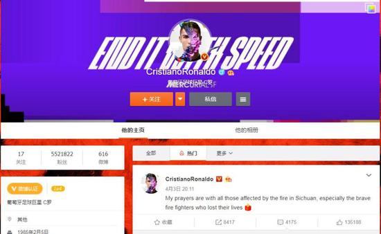 La superstar portugaise du football Cristiano Ronaldo exprime ses condoléances aux victimes des incendies de forêt dans la province du Sichuan, qui ont co?té la vie à 30 personnes. (Photo / Capture d'écran sur Weibo)