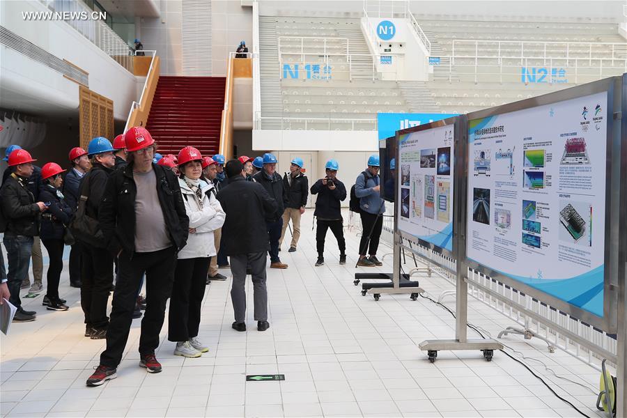 Photo prise le 8 avril 2019 montrant des représentants des principales agences de presse mondiales lors d'une visite des sites avant la première réunion des agences de presse mondiales pour Beijing 2022, dans le Centre national de natation à Beijing, capitale chinoise. Les représentants des principales agences de presse sont à Beijing pour un premier aper?u des installations pour les Jeux olympiques d'hiver de 2022. (Photo : Xu Zijian)