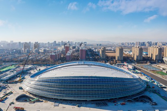 Dans l'après-midi du 31 décembre 2019, la construction de site symbolique des JO d'hiver de Beijing 2022, l'Anneau national de patinage de vitesse, est achevée. On peut voir clairement et entièrement "le ruban de glace" qui "danse dans l'air". Photo par He Yong, journaliste du Quotidien du Peuple