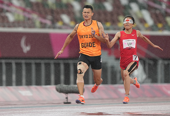 Liu Cuiqing et son guide voyant Xu Donglin participent à la finale du 200 mètres Femmes catégorie T11 aux Jeux paralympiques de Tokyo 2020, le 4 septembre. (Photo / Xinhua)