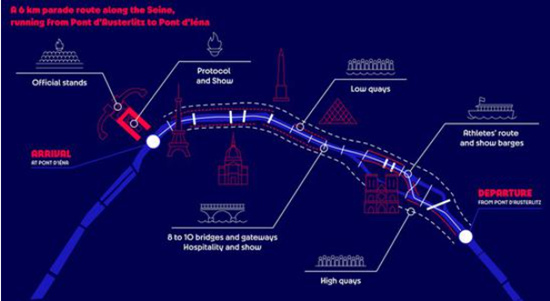 Quelque 160 bateaux transporteront les athlètes, naviguant sur six kilomètres du Pont d'Austerlitz au Pont d'Iéna, avec pour toile de fond le fleuve et les monuments emblématiques de la capitale comme Notre Dame, le Louvre et la Tour Eiffel.