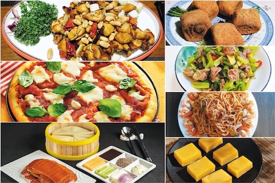 Des plats au menu des athlètes pendant les Jeux olympiques et paralympiques d'hiver de Beijing 2022 comprenant (dans le sens des aiguilles d'une montre à partir du haut à gauche) du poulet kung pao, des gateaux lvdagun, de l'émincé de b?uf sauté au céleri, des spaghettis, des gateaux de pois, du canard laqué de Pékin et de la pizza margherita. (Photo/China Daily)