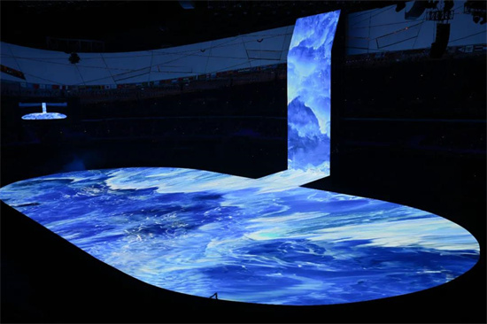 Les panneaux indicateurs ? flocon de neige ? des Jeux olympiques d'hiver de chaque délégation se sont transformé en un gros flocon de neige sous la connexion de rameaux d'olivier, mettant ainsi en scène ? La neige de Yanshan est aussi grande qu'une natte ? dans le stade ? Nid d'Oiseau ?.