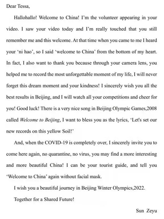 Dans sa réponse, il a remercié Tessa de l'avoir aidé à enregistrer les moments les plus inoubliables de sa vie, et lui a souhaité, ainsi qu'à tous les athlètes de ? renouveler les records en terre jaune ? comme le disait la chanson-thème des Jeux olympiques de Beijing 2008 ? Beijing vous souhaite la bienvenue ?. Finalement, il souhaite que Tessa puisse revenir en Chine et alors il enlèvera son masque pour lui dire encore ? Bienvenue en Chine ! ?