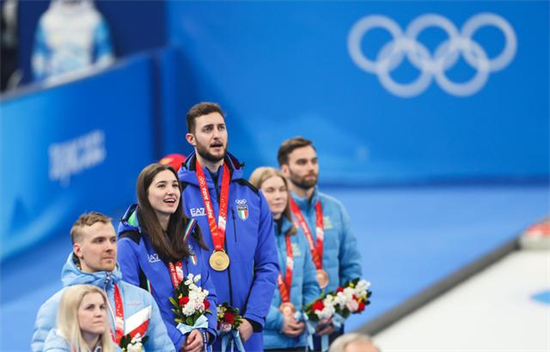 Le 8 février, l'équipe d'Italie a décroché la médaille d'or du curling double mixte aux Jeux olympiques d'hiver de Beijing 2022, l'équipe de Norvège et l'équipe de Suède ont repectivement pris la deuxième et la troisième place. (Liu Xu/Xinhua)