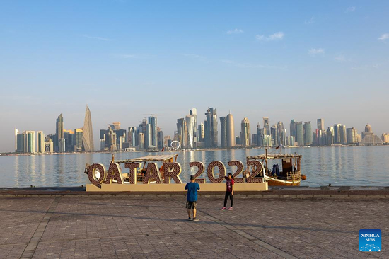 Des gens prennent des photos avec une installation de la Coupe du Monde de la FIFA 2022 près de la Corniche de Doha, au Qatar, le 11 novembre 2022. (Photo / Xinhua)