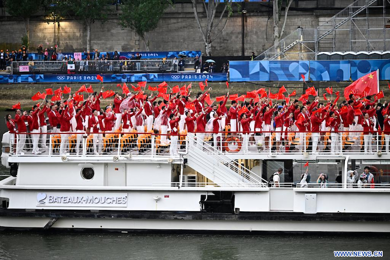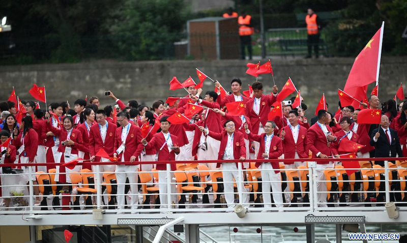 | Des membres de la délégation chinoise assistent à la cérémonie d'ouverture des Jeux olympiques de Paris 2024 à Paris, en France, le 26 juillet 2024. (Xinhua/He Canling) |