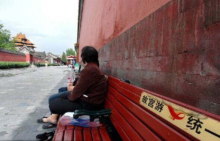 | Des visiteurs, assis sur un banc de la Cité Interdite. |