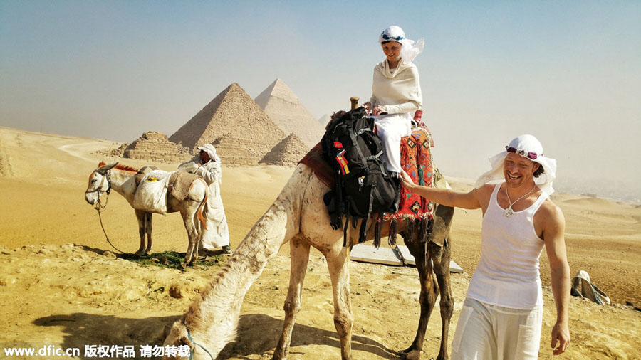 Cheetah et Rhiann Platt, devant les Pyramides de Gizeh (Eypte). [Photo/IC]