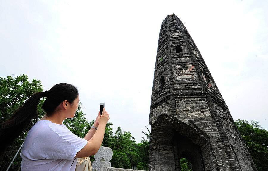 Une visiteuse prend une photo de la Pagode de Huzhu