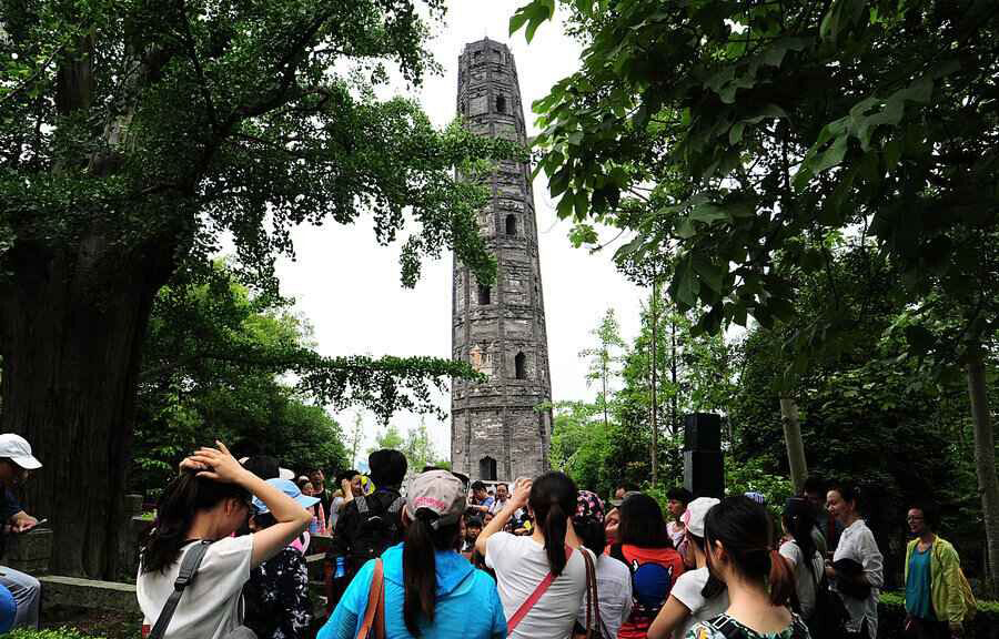 Des visiteurs prennent une photo de la pagode de Huzhu dans les monts Tianma (District de Songjiang), en banlieue de Shanghai, le 13 juin 2015. [Photo / CFP]
