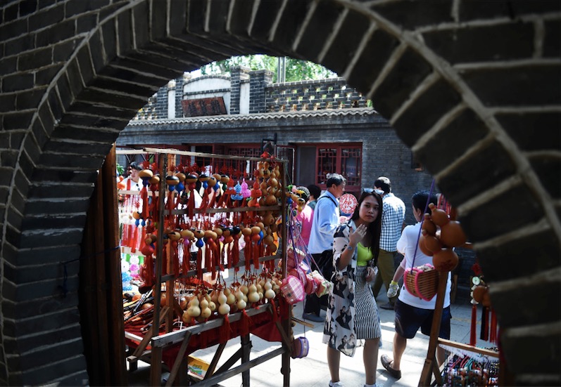 Des touristes regardent des objets réalisés avec des calebasses à Huludao, dans la province chinoise du Liaoning (nord-est), le 18 juillet 2015.