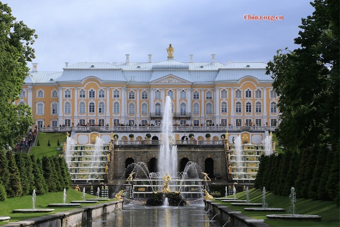 Le palais Peterhof à Saint-Pétersbourg. Le palais et ses jardins sont parfois surnommés la ? Versailles russe ?.