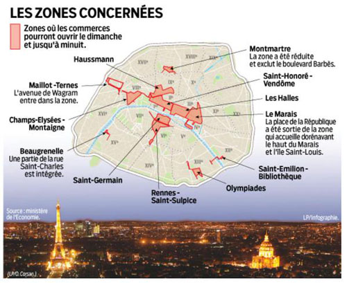 Les douze zones, au sein de laquelle les magasins pourront ouvrir le dimanche et jusqu'à minuit en semaine, sont : Saint-Germain, Rennes-Saint-Sulpice, Olympiades-Italie, Saint-Emilion-Bibliothèque, Le Marais (y compris le Haut Marais et de l'Ile-Saint -Louis, mais pas la Place de la République), les Halles, Saint-Honoré-Vend?me, Montmartre, Haussmann, Maillot-Ternes (avec l'avenue Wagram), Champs Elysées-Montaigne et Beaugrenelle (avec une partie de la rue Saint-Charles).