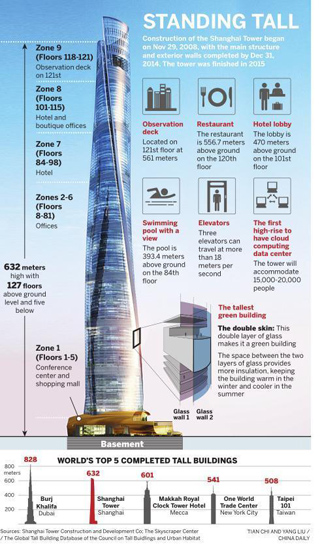 Culminant à 632 mètres, la structure est devenue le deuxième plus haut batiment de la planète, derrière les 828 mètres du Burj Khalifa à Duba?. Le Tour de Shanghai abritera des bureaux, un h?tel, des galeries, un musée et l'art, avec de nombreuses conférences et expositions.