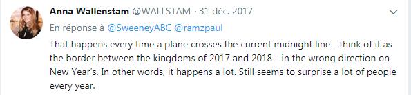 Un utilisateur de Twitter, Anna Wallenstam, a décrit ainsi ce vol inédit : ? Cela arrive chaque fois qu'un avion franchit la ligne de minuit actuelle -imaginez-la comme la frontière entre les royaumes de 2017 et 2018- dans la mauvaise direction pour le Nouvel An ?, a-t-elle souligné dans un message. ? En d'autres termes, cela arrive souvent, beaucoup plus qu'on ne pourrait le croire, et cela semble pourtant toujours surprendre beaucoup de gens chaque année ?.