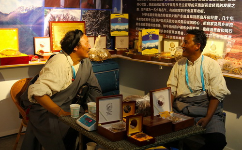 Des marchands de champignons de la ville de Nagqu, au Tibet, vus lors de l'exposition. (Photo Palden Nyima / China Daily)