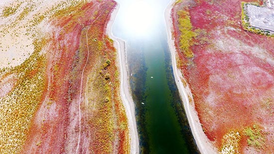 L'automne est arrivé. Dans la région pétrolière nord-ouest du Tarim de la ville de Kuche, dans la région autonome ou?ghoure du Xinjiang (nord-ouest de la Chine), la rivière Tarim sinueuse, les rizières de couleurs variées, les puits de pétrole standardisés et les oiseaux volant dans le ciel créent ensemble une belle image, offrant un paysage aussi pittoresque que mysterieux. (Photo / Tan Hui)