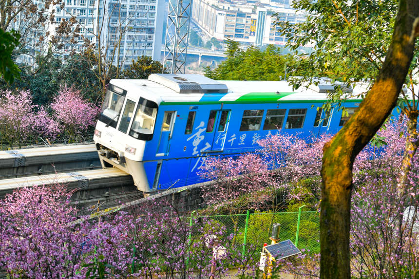 à la municipalité de Chongqing (sud-ouest de la Chine), en février, les fleurs sont en pleine floraison et tout revient à la vie. Les magnifiques pruniers décorent la voie de la ligne 2 du transport de rail de Chongqing, incitant le public à sortir et à se promener.
