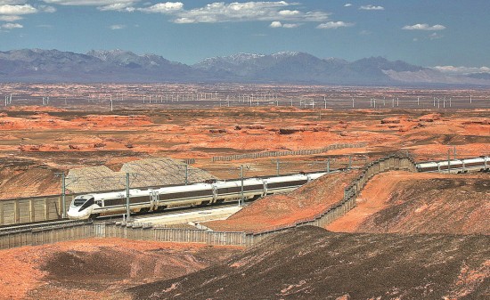 Un train à grande vitesse CRH5E circule sur la ligne de chemin de fer à grande vitesse Lanzhou-Urumqi, dans la région autonome ou?ghoure du Xinjiang (nord-ouest de la Chine), en juin. (Photo / Xinhua)