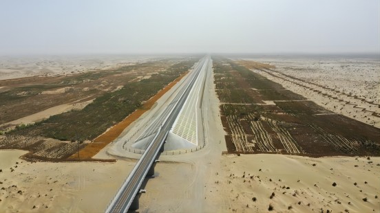 En juin 2022, la première boucle ferroviaire au monde autour du désert, longue de 2 712 kilomètres, a été achevée. Cette ligne ferroviaire, qui s'étend sur des milliers de kilomètres, facilite non seulement les déplacements des personnes de tous les groupes ethniques le long de la ligne, mais relie également de nombreuses villes du sud de la région autonome ou?ghoure du Xinjiang.