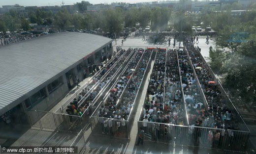 | Les usagers font la queue pour entrer dans la station de métro menant au contr?le de sécurité. Une bannière rappelle aux passagers de commencer à se préparer plus t?t, le 26 mai 2014. |