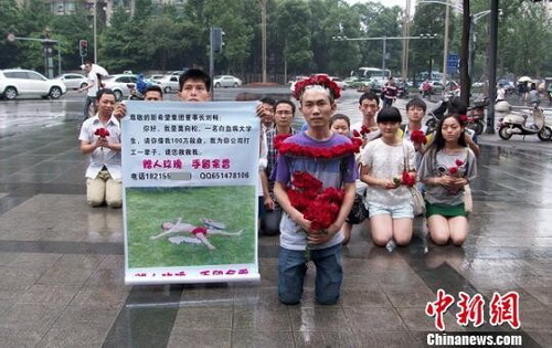 Mo Xiangsong, un pauvre étudiant souffrant de leucémie, s'est mit à genoux devant un batiment appartenant au New Hope Group, un conglomérat chinois et l'une des plus importantes entreprises agroalimentaires, à Chengdu, la capitale de la province du Sichuan (sud de la Chine).