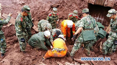 Dimanche soir, des coulées de boue dans le village de Dongshan ont rasé de nombreuses maisons et emporté cinq villageois. Lundi après-midi, les secouristes avaient retrouvé trois corps.