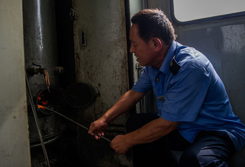 Le travail de Mao Xiqing, un ingénieur de train, consite à ajouter du charbon à une chaudière, le 9 juillet 2014. Il a suivi cette même routine pendant plus de vingt ans. [Photo: Yu Junjie/Asianewsphoto]