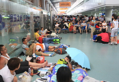 | Des passagers dans une attente forcée à l'aéroport de Dalian. De nombreux vols ont été annulés ou retardés depuis lundi, affectant dans tout le pays des dizaines de milliers de passagers. |