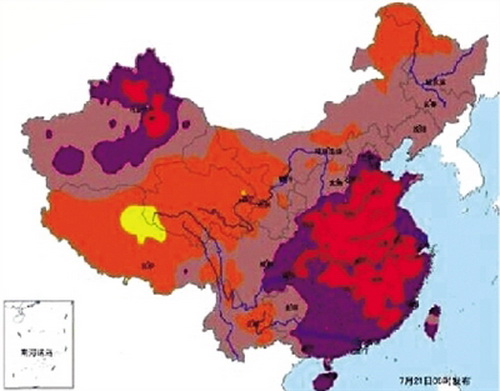 | Photo: Cette image montre les prévisions des température les plus élevées en Chine entre le 21 et 22 juillet 2014 à 8h. |