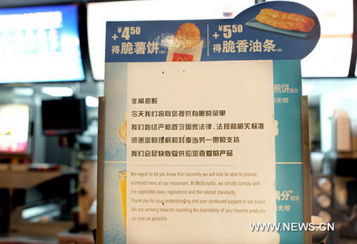 Les restaurants de McDonald's en Chine sont confrontés à une pénurie après la décision de cette cha?ne de restauration rapide de rejeter tous les produits d'OSI Group et des joint-ventures de ce dernier, a indiqué lundi à Xinhua un responsable de McDonald's Chine.