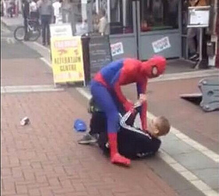 Le Spider-Man de Dublin, en fait un des artistes de rue les plus en vue de la capitale irlandaise, est devenu un phénomène des médias sociaux après avoir été pris en vidéo en train de se battre contre un homme qui aurait tenté de lui voler son argent. La bagarre, qui a duré près de trois minutes, s'est rapidement de la page Facebook d'un témoin aux journaux irlandais avant d'arriver bient?t en tête de la page YouTube du pays.