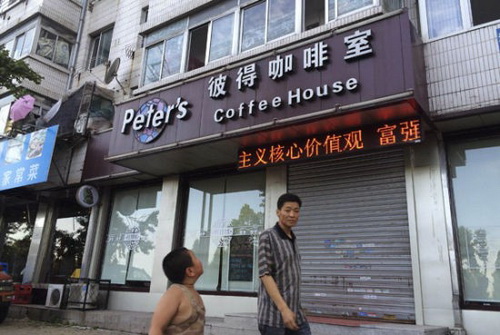 | Un jeune gar?on regarde en passant le café fermé exploité par le couple canadien Kevin Garratt et Julia Dawn Garratt à Dandong, dans la Province du Liaoning, le 5 ao?t 2014. |