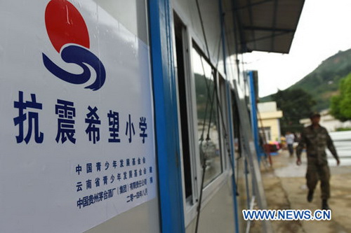 La construction de la première école temporaire dans les zones sinistrées par un séisme qui a secoué la semaine dernière la province du Yunnan (sud-ouest) s'est achevée mardi.
