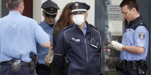 | Un policier portant un masque de protection, devant l’agence pour l’emploi où la femme s’est évanouie. |