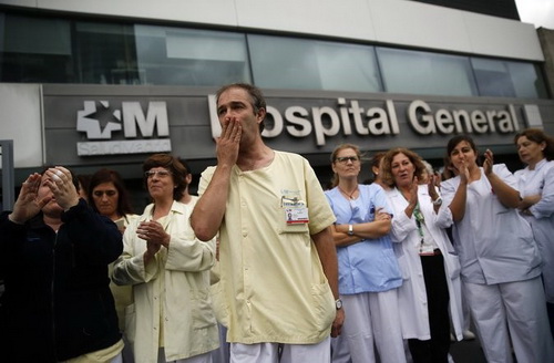 | Des employés de l’h?pital universitaire de la Paz à Madrid manifestent pour demander la démission du ministre de la santé, Ana Mato. |