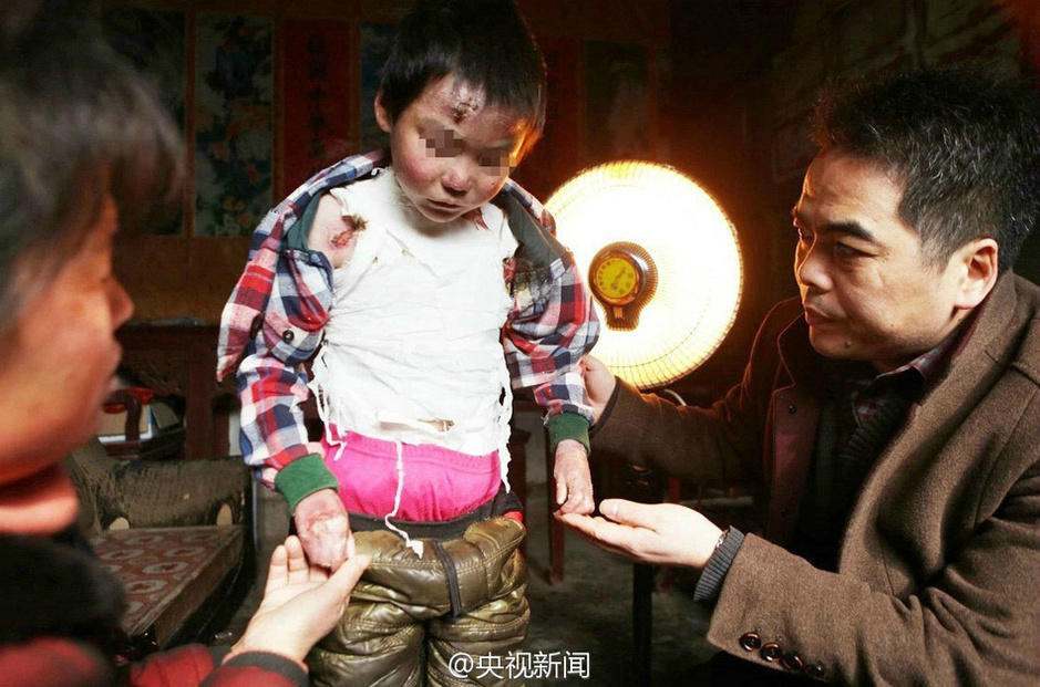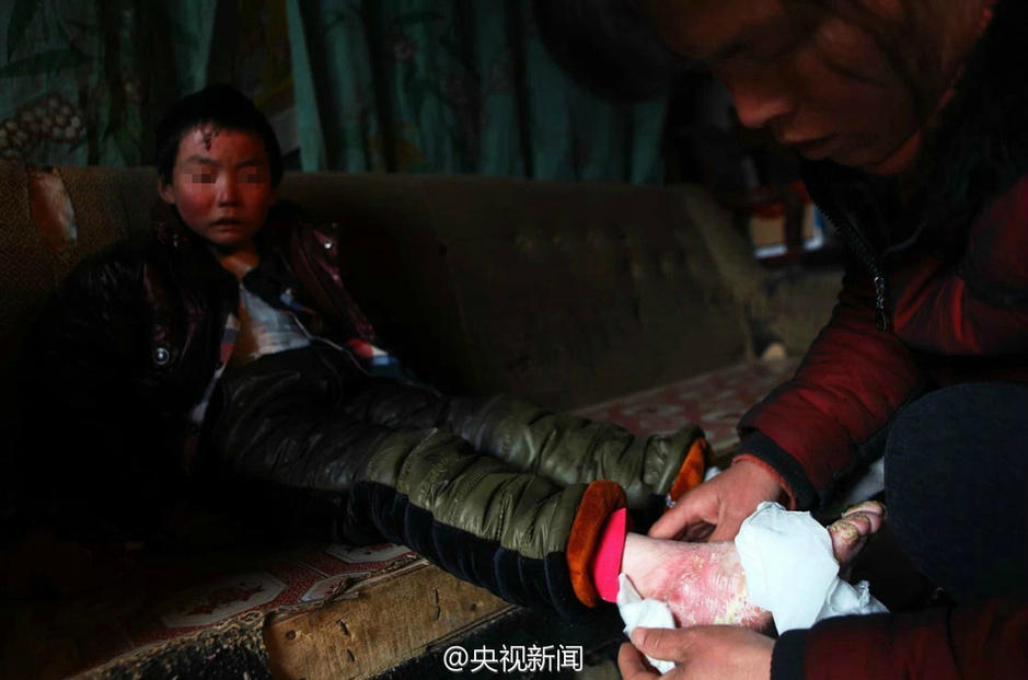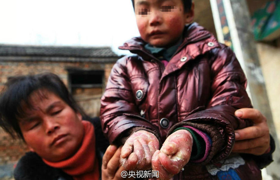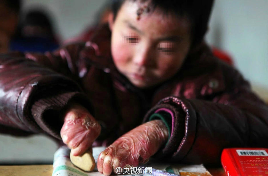 Quand la veste et les chaussures du petit Chen Liusong ont été retirées, c'est un terrible spectacle qu'a pu voir le journaliste : le malheureux enfant vit entièrement enveloppé dans du papier-toilette. Parce que sa peau est toujours abimée, il suffit que des vêtements la touchent pour lui causer des dommages. Le papier-toilette peut non seulement protéger la peau de l'enfant, mais aussi absorber le sang qui coule des ulcères de la peau.