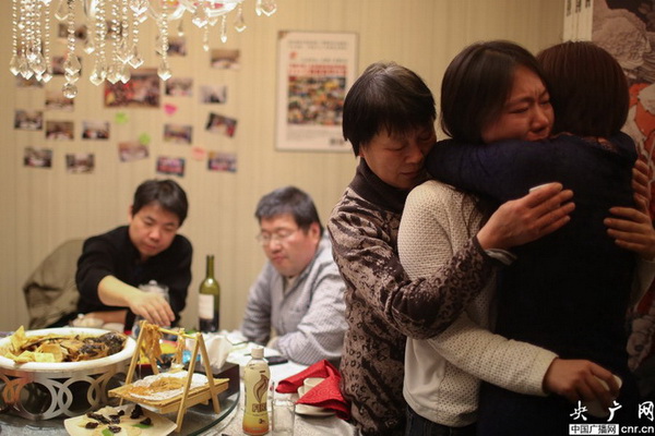 Deux femmes s’étreignent lors d’une réunion de membres de familles du vol disparu MH370. Certaines familles qui comptent des disparus se referment sur elles-mêmes, elles ne veulent plus fréquenter leurs amis d’avant, et sur la piste de leurs proches perdus, elles se rassemblent entre elles à la recherche de chaleur et de réconfort.