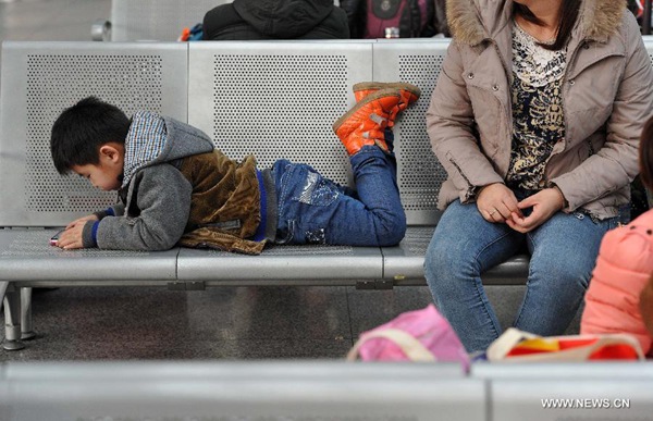 Liu Yuchen, six ans, joue sur une chaise en attendant le train avec sa mère à la gare de Yinchuan, capitale de la région autonome du Ningxia Hui, au nord-ouest de la Chine, le 2 février 2015. [Photo / Xinhua]