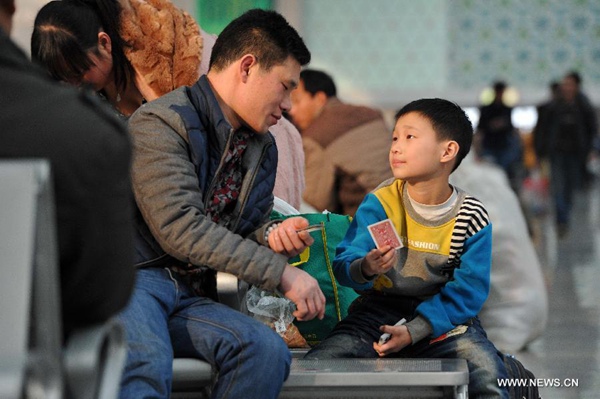| Wang Jiaqi (C), quatre ans, et les membres de sa famille attendent leur train à la gare de Yinchuan, capitale de la région autonome du Ningxia Hui, au nord-ouest de la Chine, le 2 février 2015. [Photo/Xinhua] |