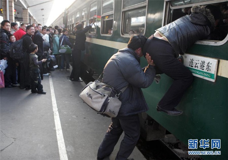 Le 26 février 2007, un passager aide un autre à monter à bord d'un train par la fenêtre.
